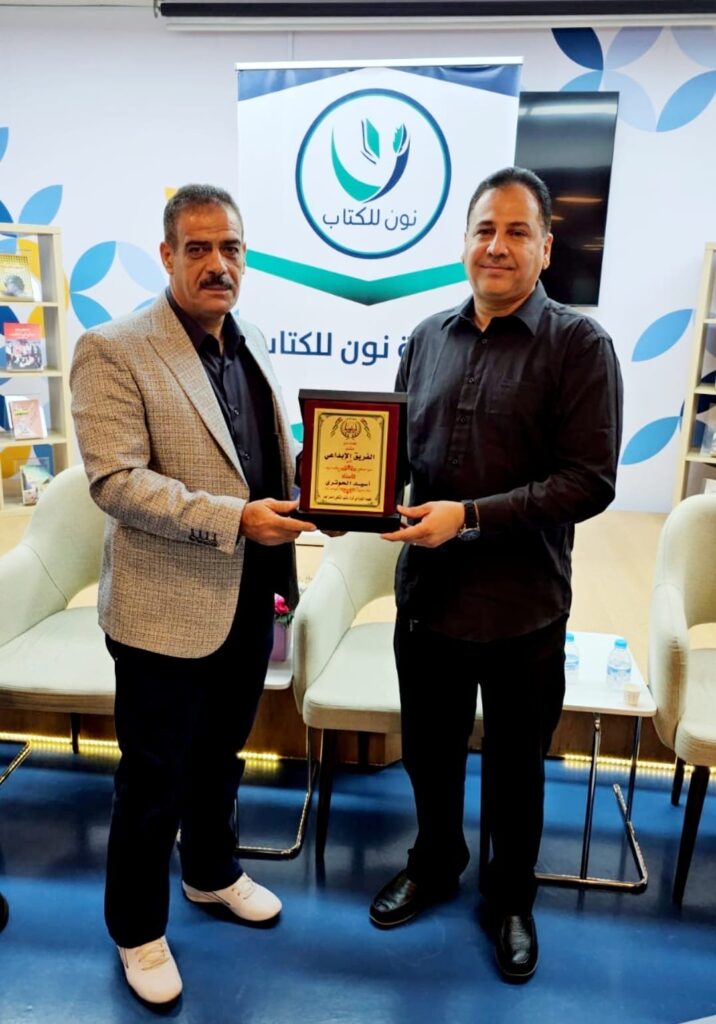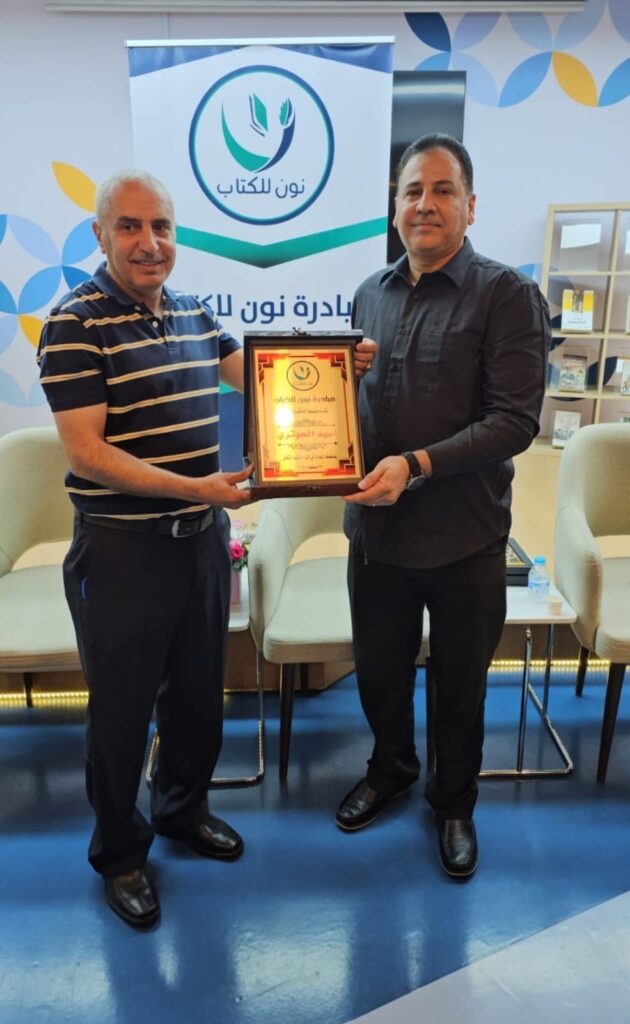 في ختام الأمسية، كرّم أعضاء مبادرة نون للكتاب الكاتب الحوتري بدرع تقديري وهدايا متنوعة احتفاءً بمساهمته الأدبية ودوره المؤسس في إطلاق المبادرة، كما قدم رئيس منتدى الفريق الإبداعي رائد عساف درعاً تكريمياً آخر. هذا وقد توجه المشاركون بالشكر الجزيل للمضيف مكتبة عبد الحميد شومان ولإدارة فعالياتها ممثلة بالسيدة راية كعابنة على دورها في إثراء المشهد الثقافي المحلي والعربي.